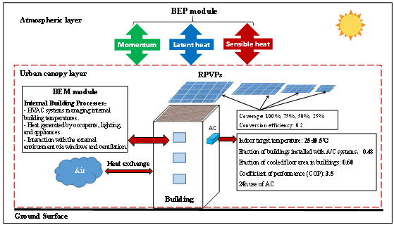 中國科學(xué)院西北生態(tài)環(huán)境資源研究院高曉清研究員團(tuán)隊(duì)聚焦我國典型復(fù)雜地形城市——蘭州,在熱浪事件背景下,利用國際先進(jìn)的中尺度氣象模型(WRF)并耦合城市建筑效應(yīng)參數(shù)化與建筑能耗模型(BEP+BEM),精細(xì)模擬了不同覆蓋率(25%、50%、75%、100%)下的屋頂光伏對(duì)城市熱環(huán)境的多維度影響。